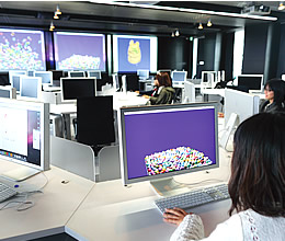 「Webメディア表現」を中心に「感性映像メディア表現」「ものづくりメディア表現」の3領域を、情報に関する充実した基礎関連科目のもと、技術革新にも対応できる技術者の養成をめざします。特に、実践的知識の修得を重視し、演習科目のほかに講義科目においても専用のCGスタジオ設備、グラフィックス・ワークステションや超高速ギガビット・イーサ・ネットワークを利用した実践的教育を行います。
