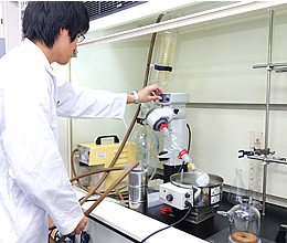 高い評価を受けている本学応用化学科の研究成果をもとに「生命環境」をキーワードとした教育と研究を行います。バイオテクノロジーと生体環境の研究を結びつけた新しい分野でもあり、新薬や機能性食品の開発、高感度分析能力を持つ環境センサや生体試料センサの開発に発展する分野です。生体の機構と機能解明を研究・教育の柱とし教育を展開。1・2年での化学の基礎の上に、2年からは環境分析などの実験を重ね、レポート作成やプレゼンテーション能力も修得。医薬品・食品・新素材・化粧品メーカーの研究開発職、環境分野やセンサ・分析機器の開発・製造会社などへの進路があります。